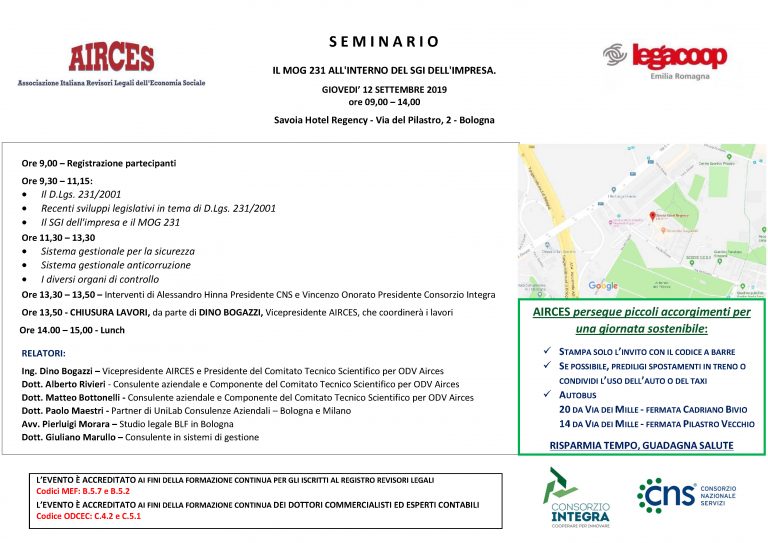 Airces ha organizzato per giovedì 12 settembre 2019, presso l’Hotel Savoia di Bologna, il seminario “IL MOG 231 ALL’INTERNO DEL SGI DELL’IMPRESA”.